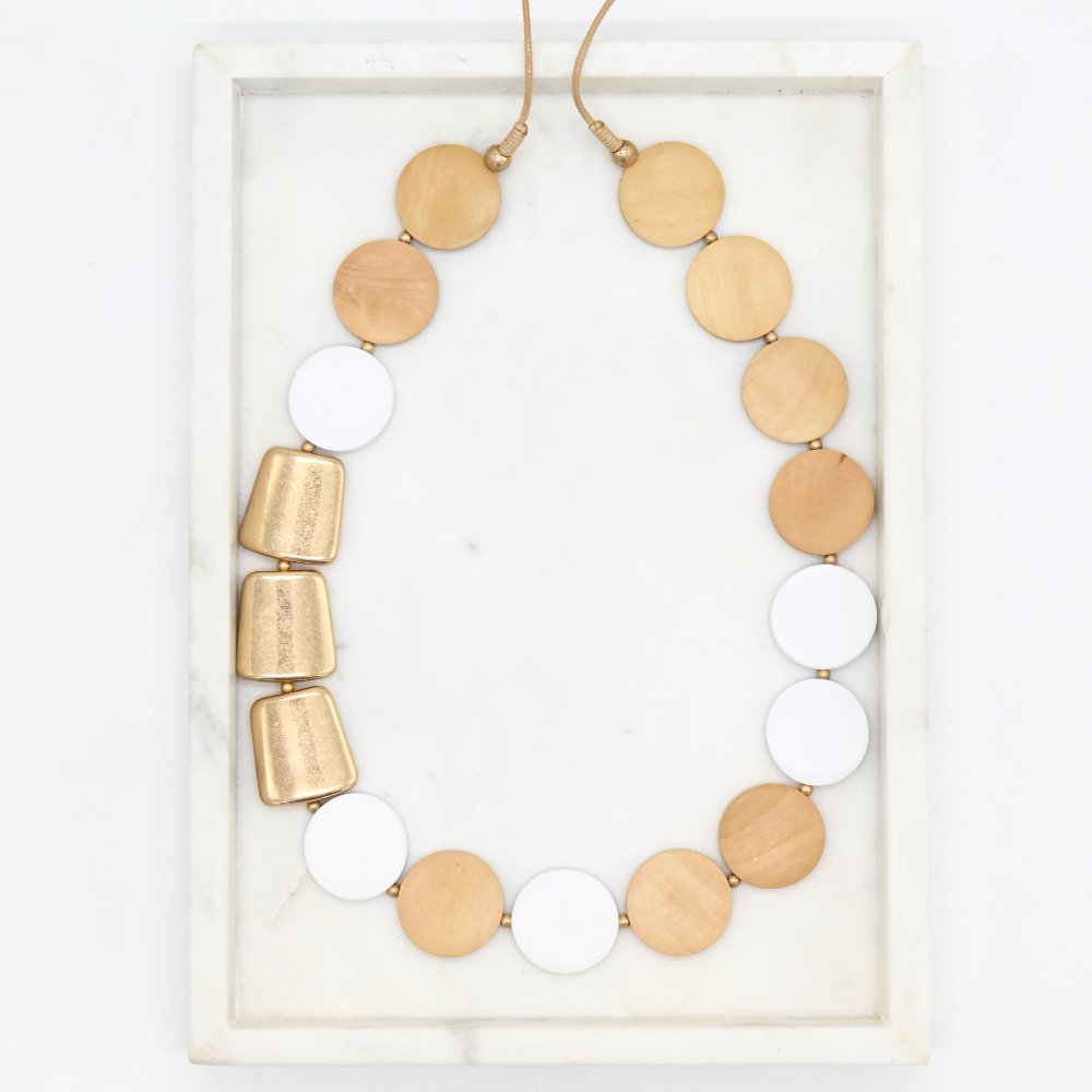 Anna Nova Wooden Necklace – adjustable necklace with natural wood beads, white round accents, and gold statement details, earthy modern style – Binny Bowe Boutique