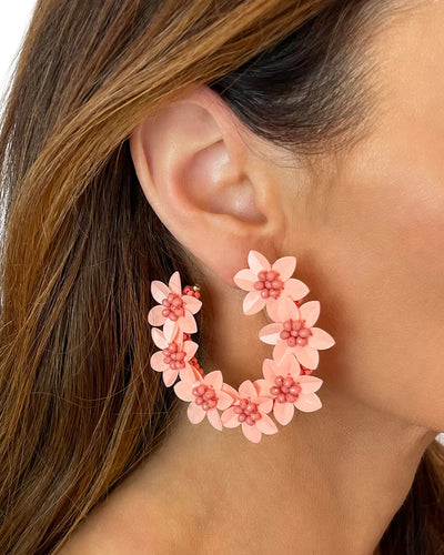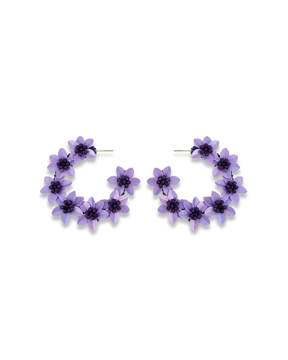 Florence Flower Earrings Mauve from Axessi – statement mauve hoop earrings with 3D flower design, bead and sequin embellishments, worn on ear – Binny Bowe Boutique