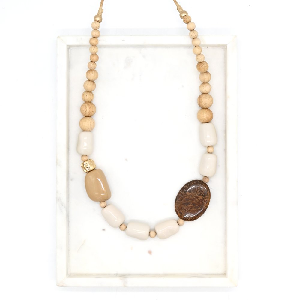 Regular price $49.00 Save $-49.00The Anna Nova Louise Beaded Necklace – Natural is a beautifully balanced statement piece designed to elevate everyday outfits with ease. Featuring a mix of natural wooden beads, smooth resin elements, and an organic statement stone, this necklace blends earthy textures with modern simplicity.