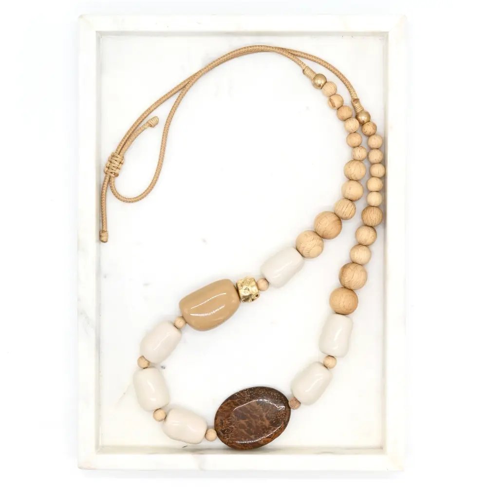 Designed with an adjustable cord, the Louise necklace can be worn at different lengths to suit your neckline or layering style. Neutral tones make it endlessly versatile – perfect with linen, knitwear, or simple dresses.