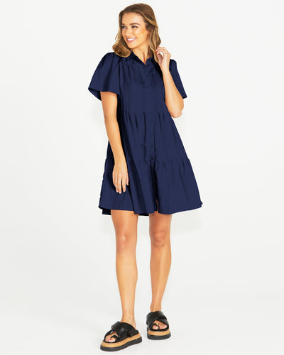 Regular price $89.95 Sale price $49.95 Save $40.00The Odell Dress in Navy from Sass Clothing brings playful charm with its mini length, collared neckline, and tiered skirt. Its short sleeves with elasticated openings add comfort and movement. A relaxed-fit piece that?s perfect for sunny days.