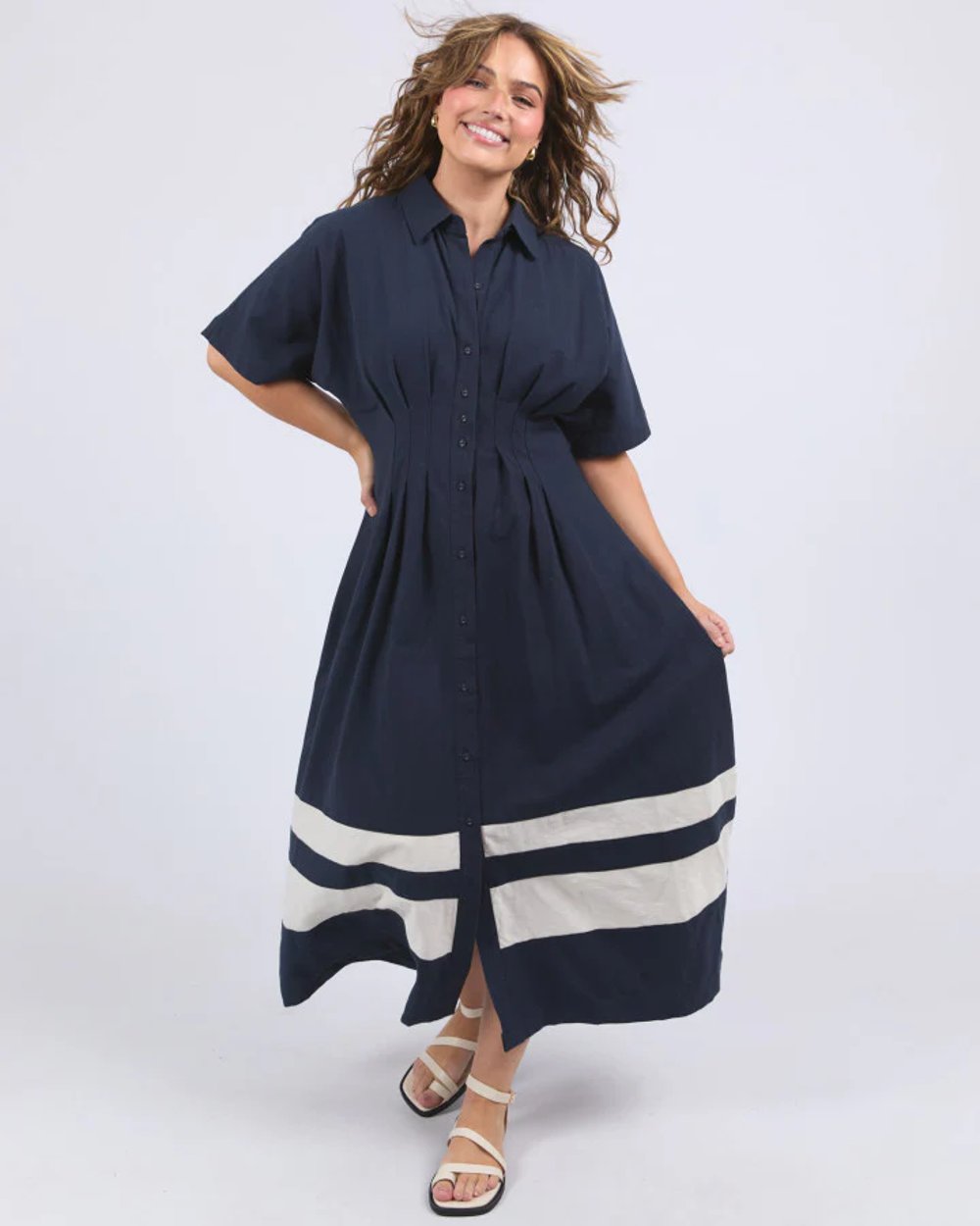Cordelia Dress Navy by Holiday front view with button through shirt dress style