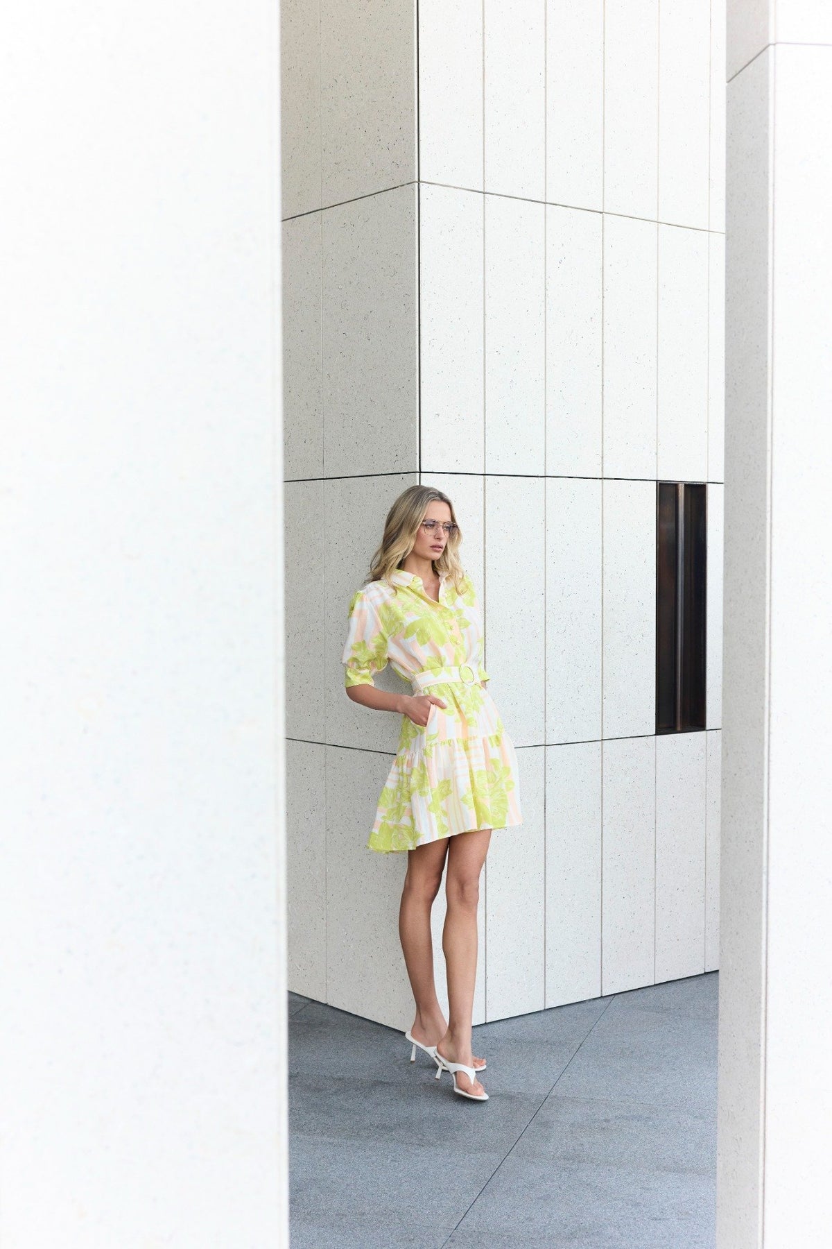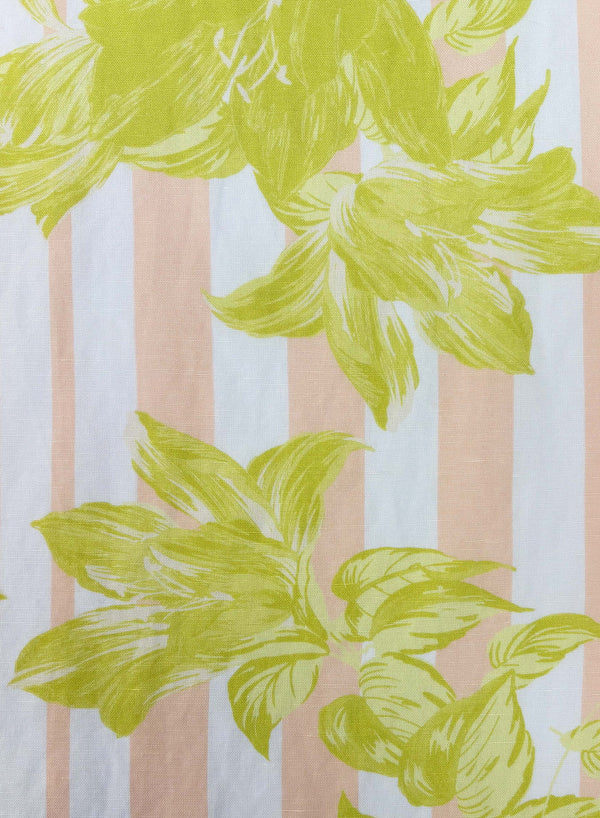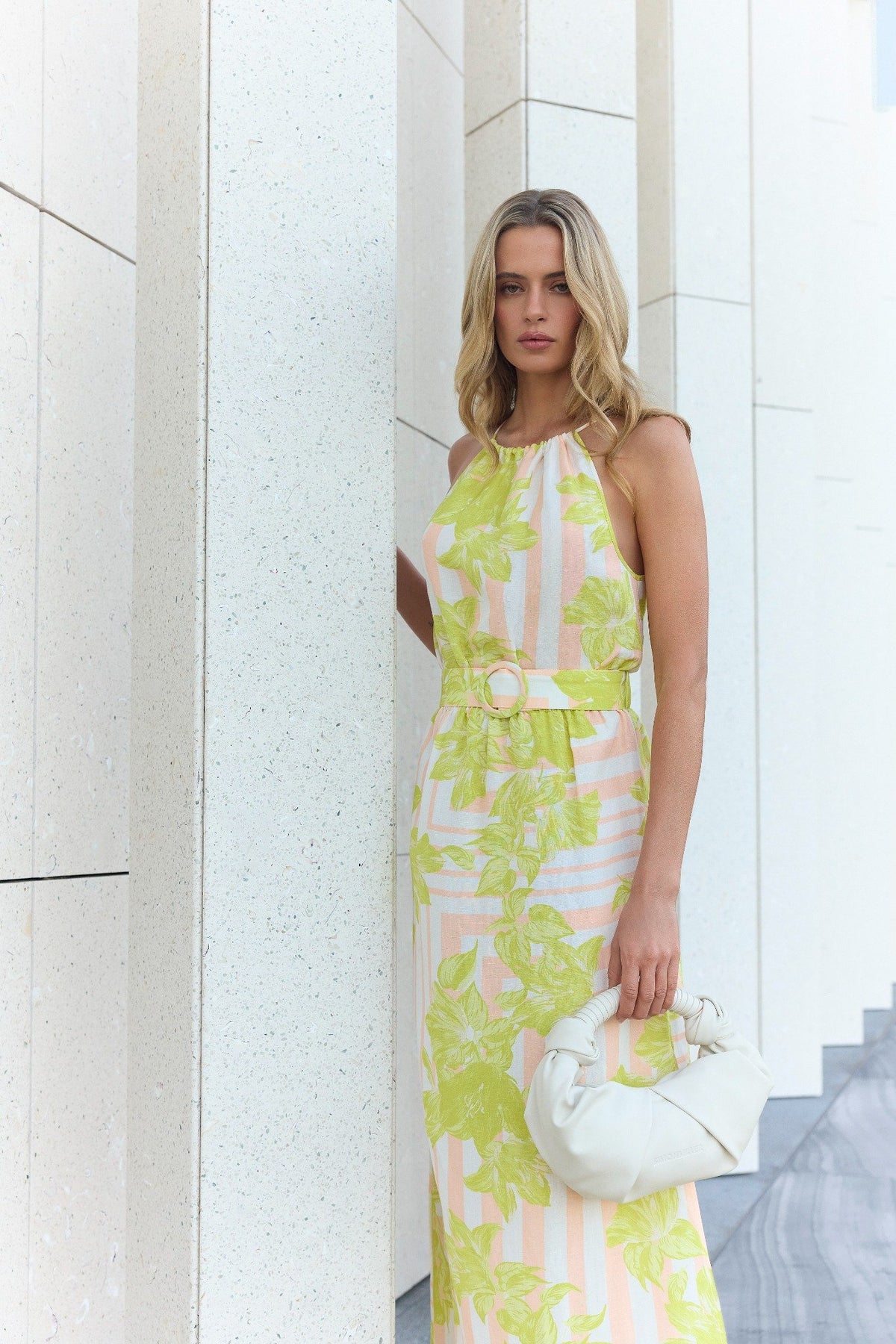 Regular price $210.00 Save $-210.00The Esmaee Soleil Maxi Dress brings fresh, modern elegance in a soft lime and pink floral print. Crafted from a natural linen–rayon blend, it offers beautiful drape, breathable comfort and effortless summer appeal. The halter-style tie-back neckline softens the silhouette, while the elasticated waist and removable belt define your shape with ease. Side slits through the skirt add movement, making it perfect for warm days, relaxed events and holiday dressing.