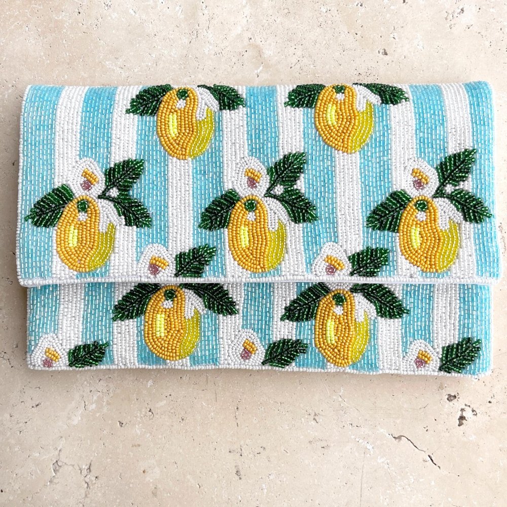 Regular price $79.95 Save $-79.95Anna Nova Lemon Stripe Beaded Clutch is a vibrant bag featuring detailed lemon and floral beadwork on soft aqua and white stripes, creating a fresh and eye-catching look perfect for spring and summer events. Designed with a magnetic clasp, internal pocket, and detachable gold chain strap, it offers both style and practicality. Ideal for weddings, race days, and special occasions.
