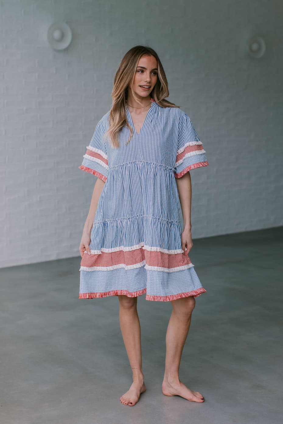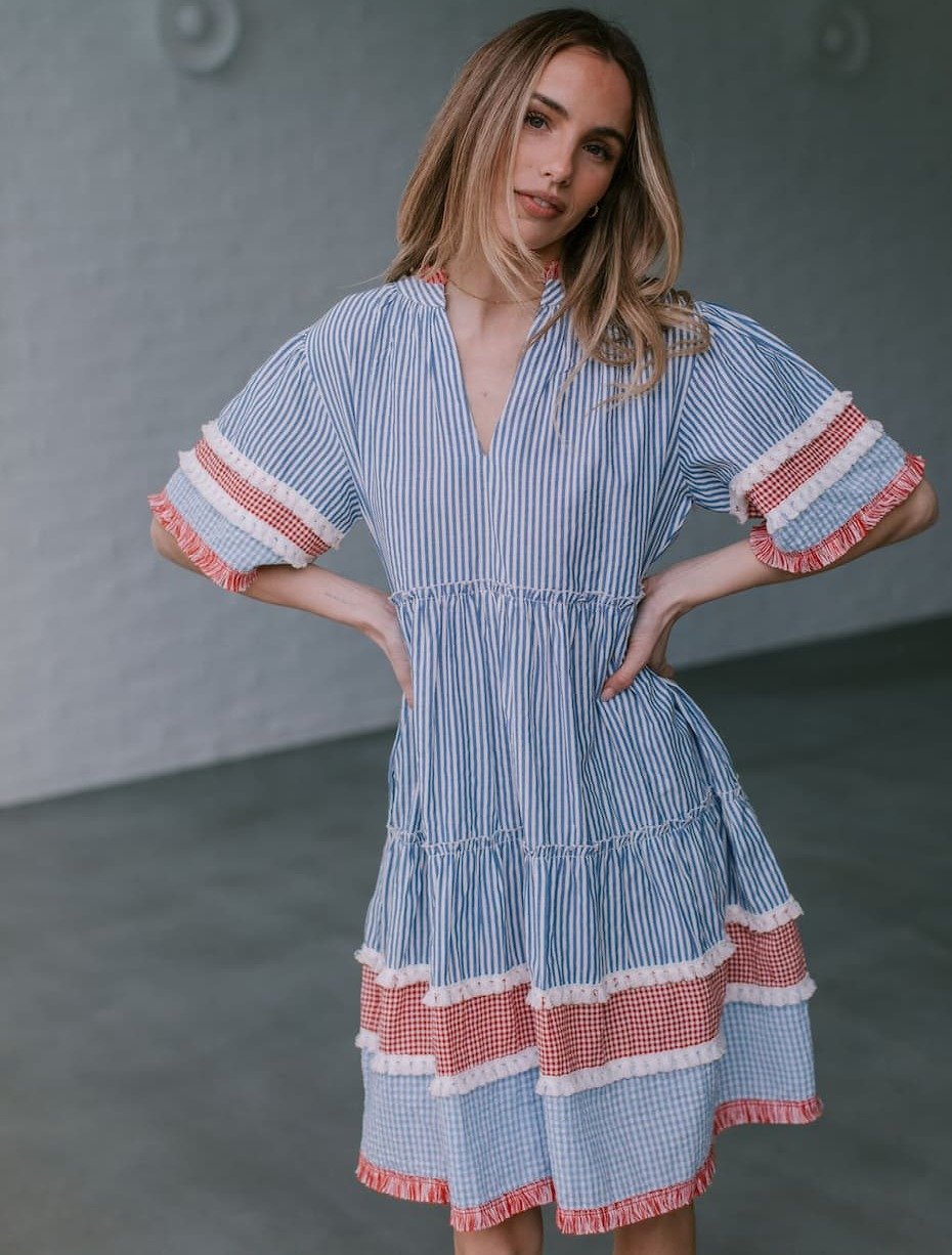 Striped border trim at hem and sleeve