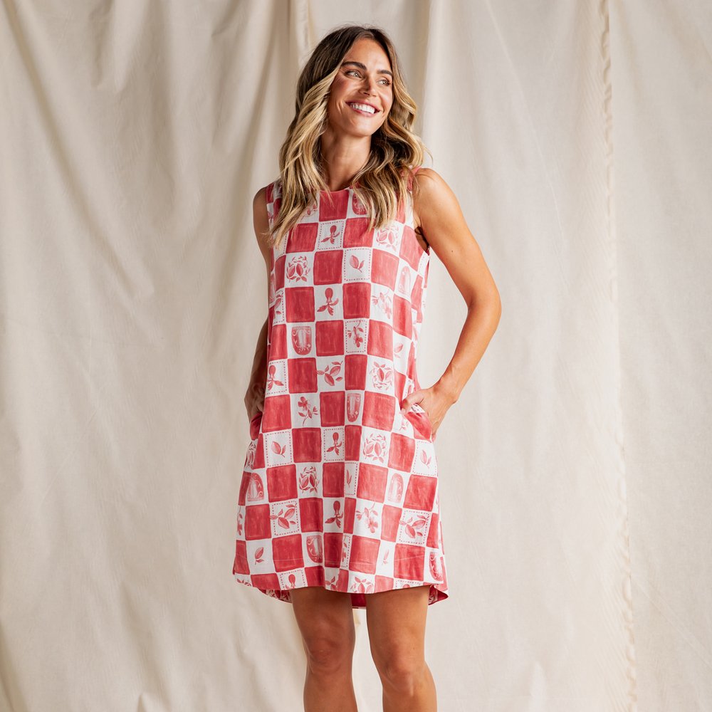 Model wearing Foxwood Biarittz Dress front view – sleeveless cotton dress with red and white check print