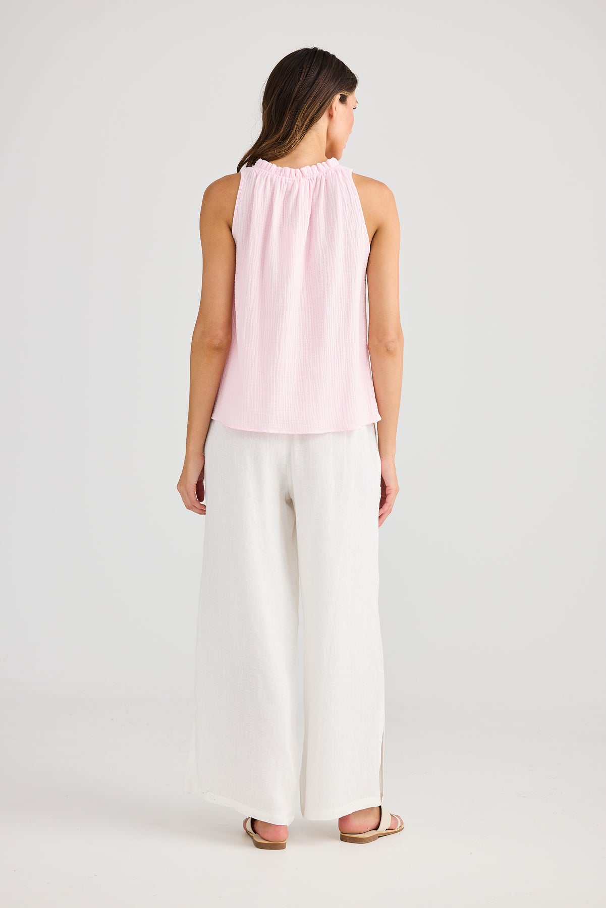 Margot Top Baby Pink Holiday – sleeveless women’s top in crinkle cotton, elasticated neckline, relaxed fit summer style – Binny Bowe Boutique