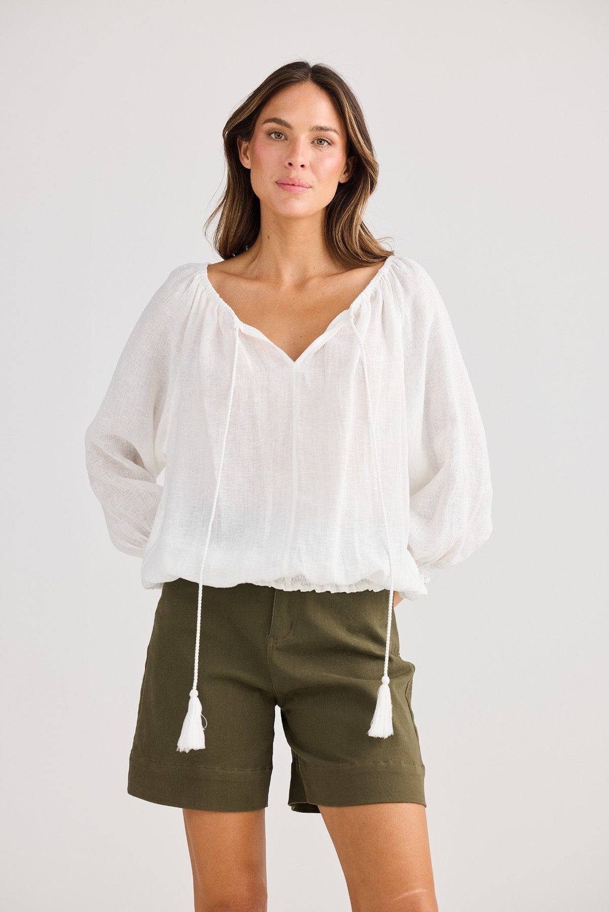 Seaside Top Holiday Olive– relaxed fit long sleeve top with raglan sleeves, tassel tie neckline and shirred details, cotton linen blend – Binny Bowe Boutique