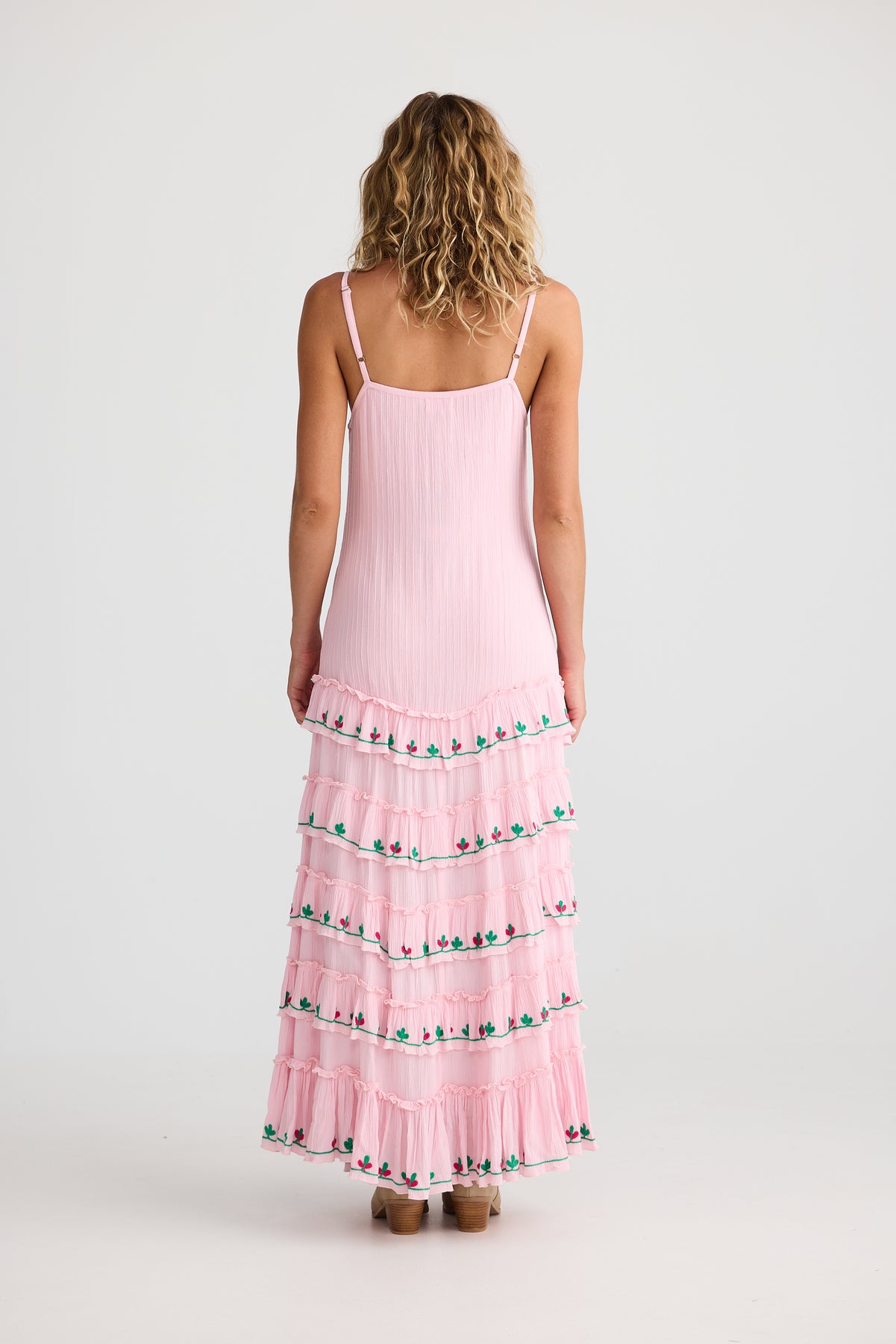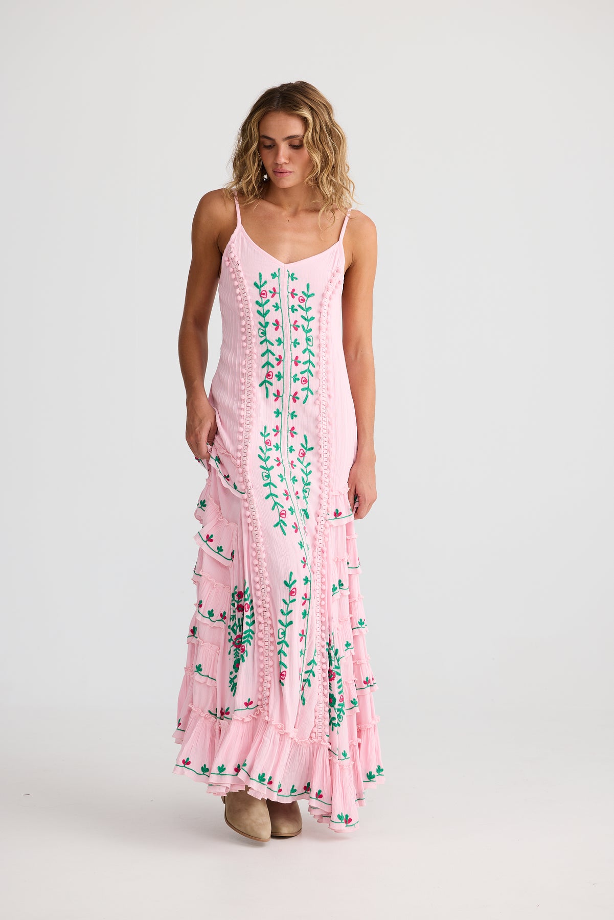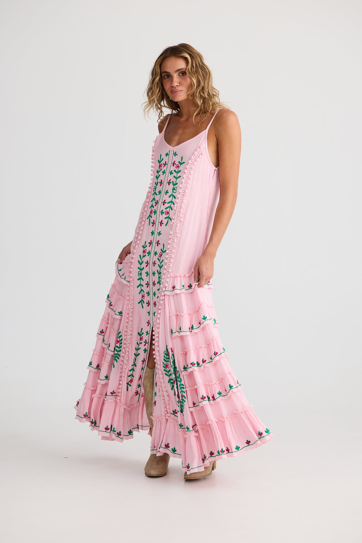 Talisman Sadira Dress Pink with Green – bohemian style summer maxi with embroidery and ruffles