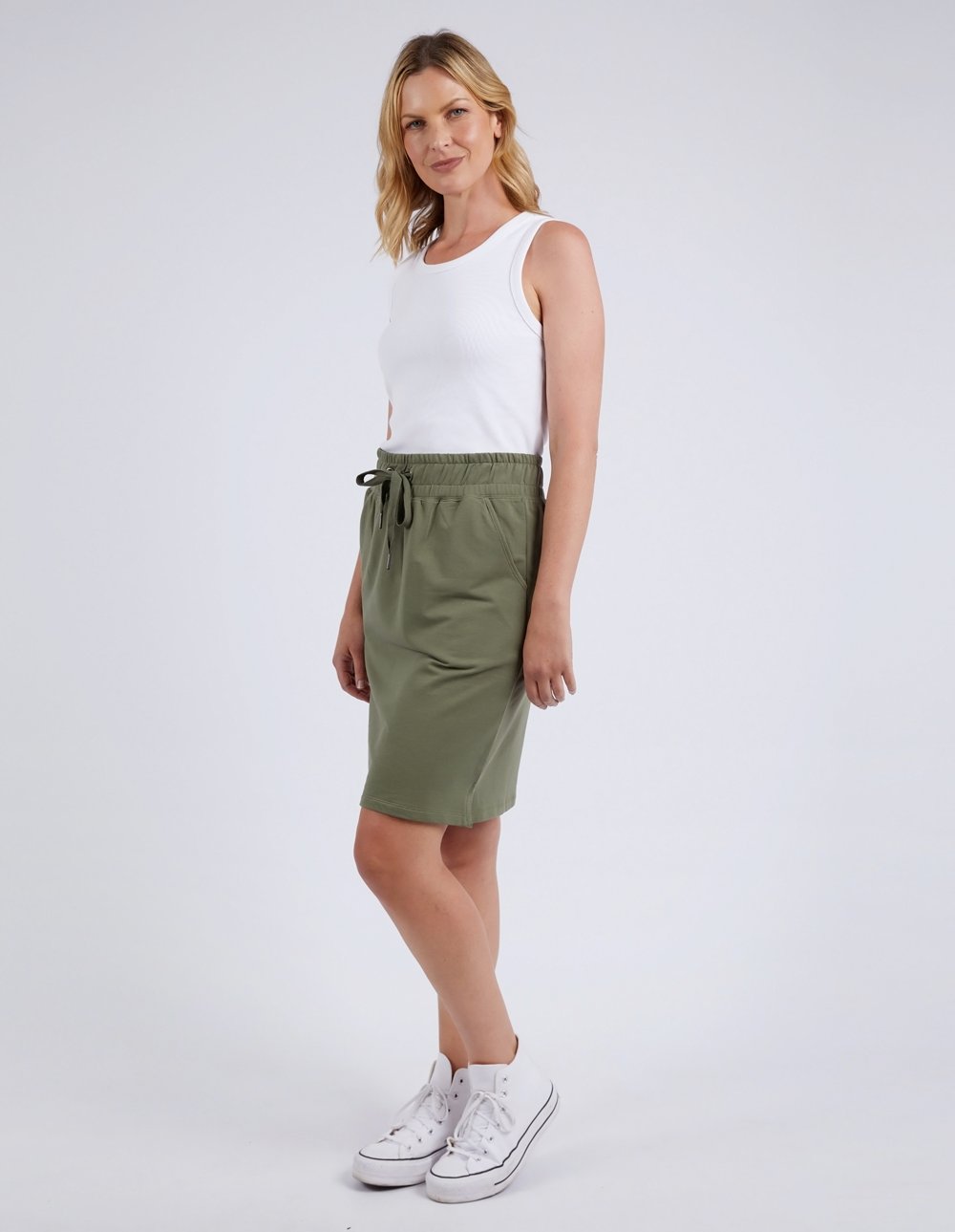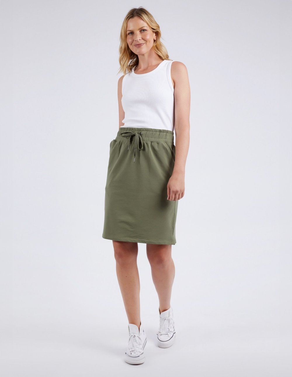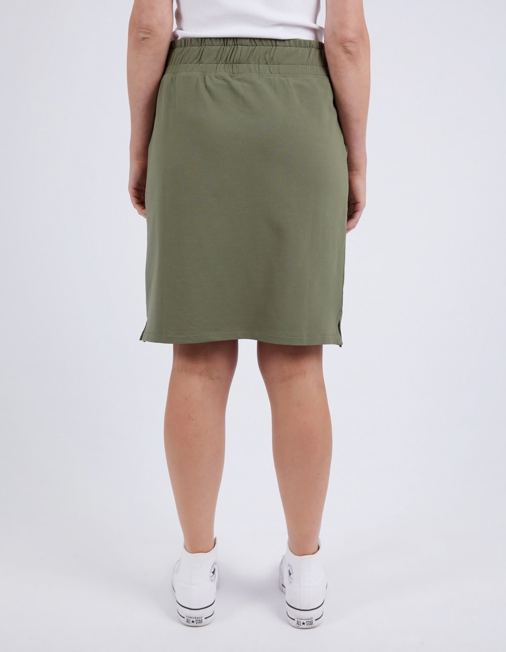 Elm Lifestyle Coby Skirt Khaki – casual cotton skirt with elastic waist and drawstring tie, available at Binny Bowe Boutique