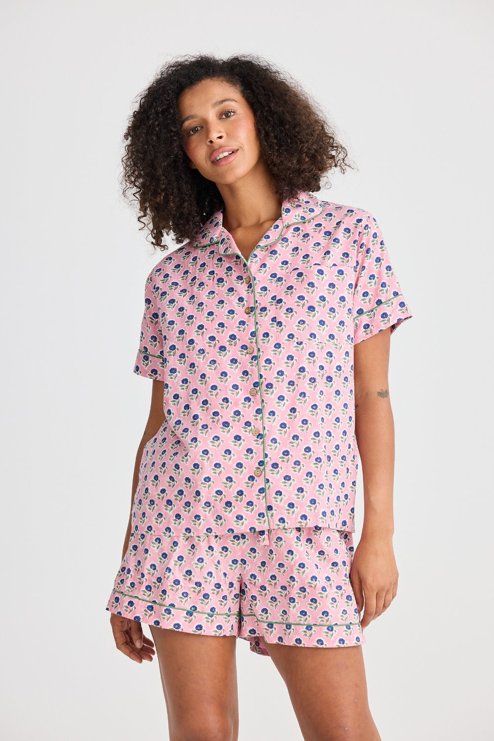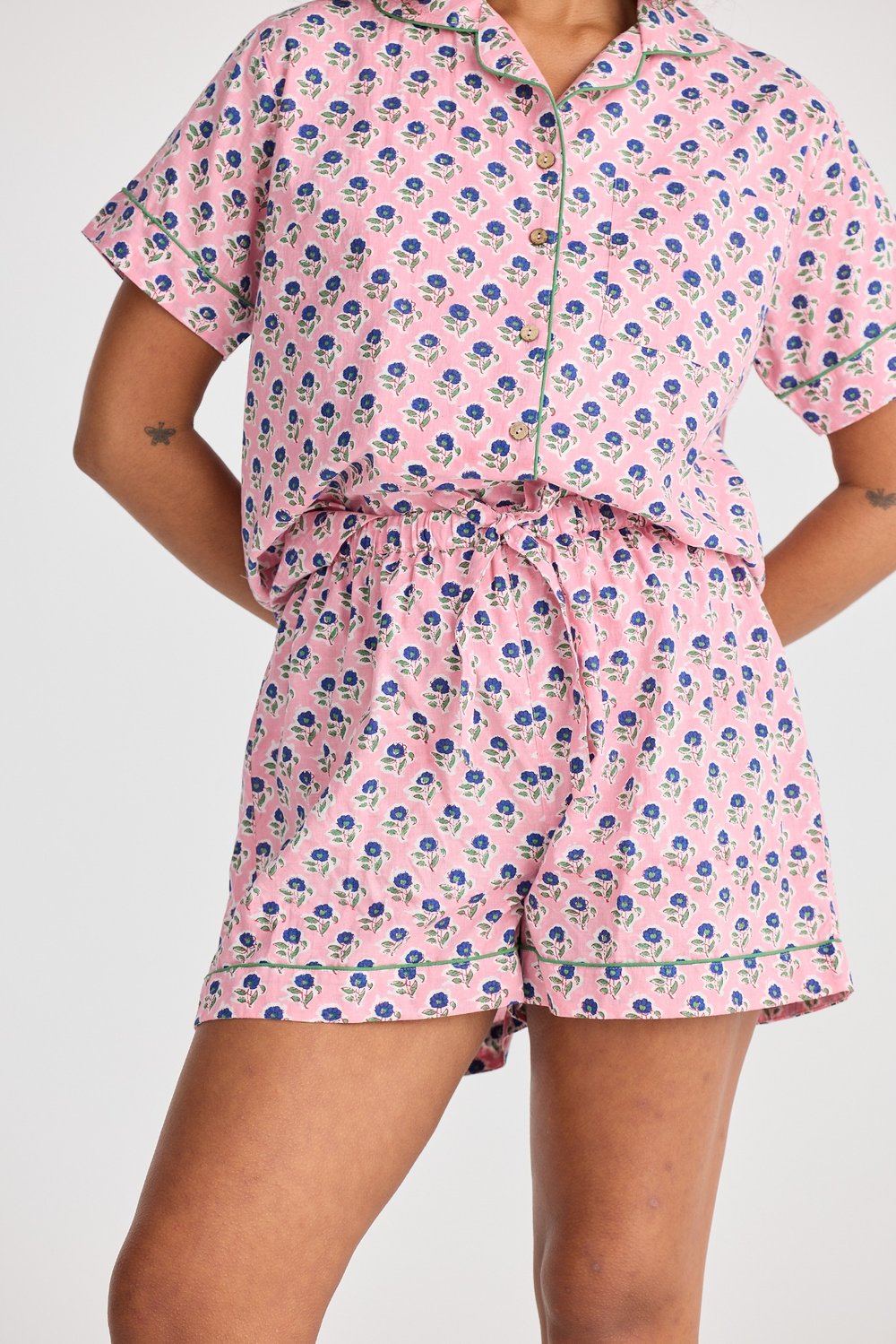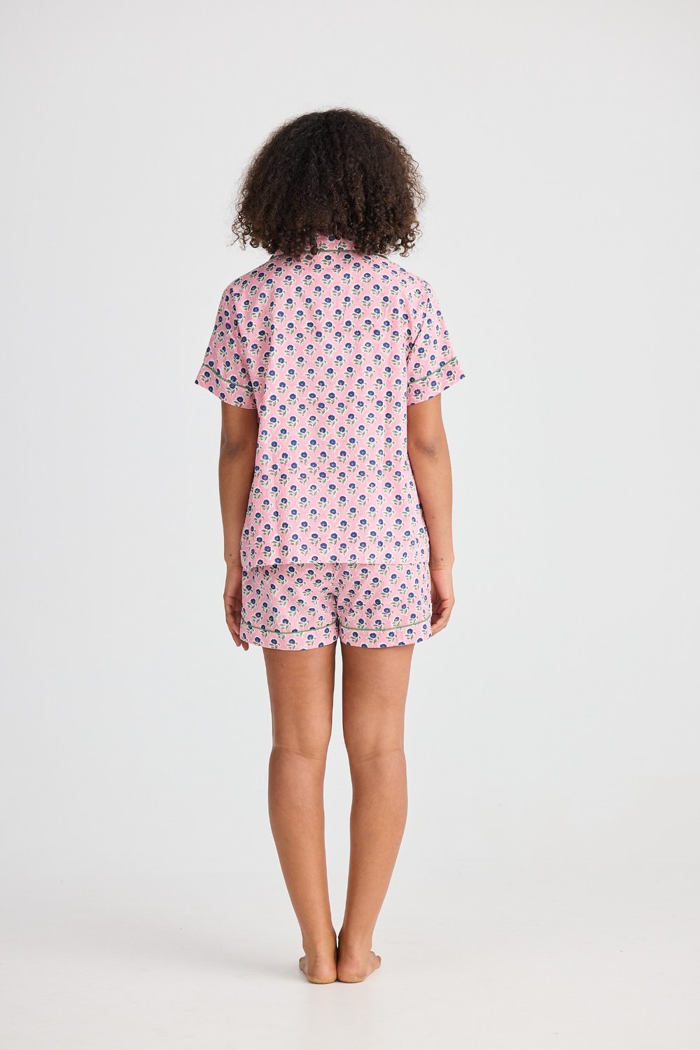 Holiday Namaste Pyjama Set in Ditsy Daisy Print – women’s pink floral short sleeve sleepwear