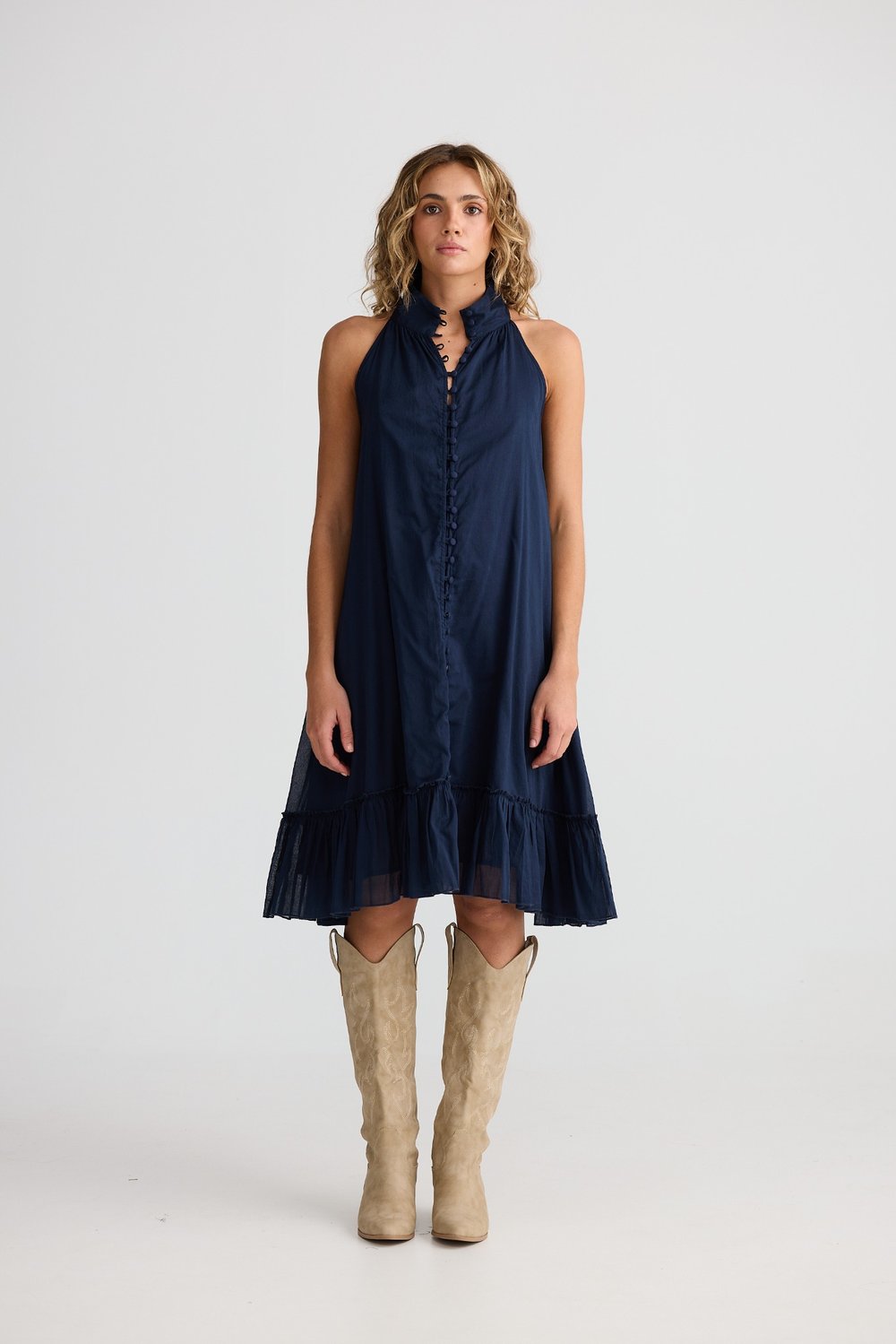 Talisman Tapas Dress Navy – sleeveless cotton dress with ruffled hem