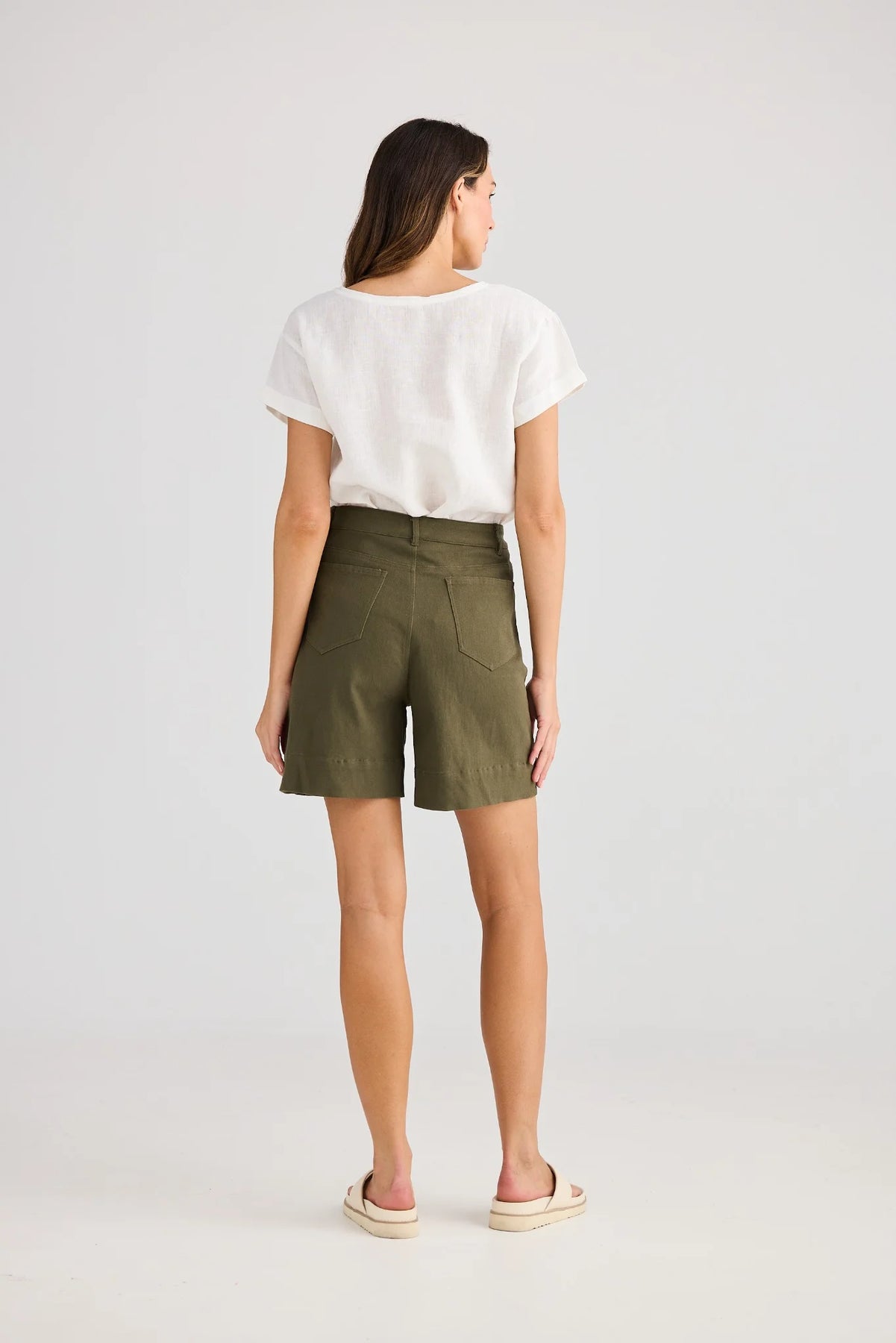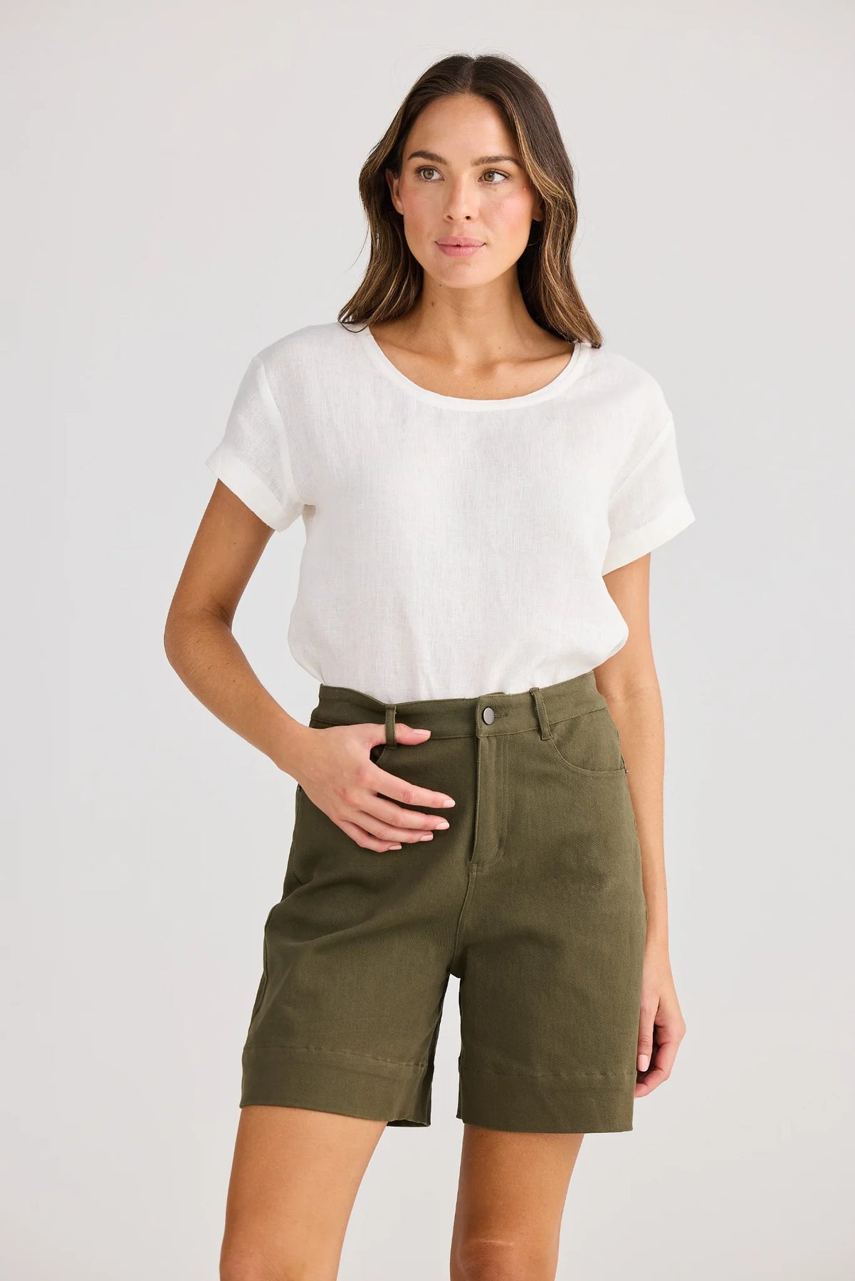 Vacation Shorts Khaki –  Close Up women’s casual mid-length shorts with pockets, lightweight and comfortable fit.