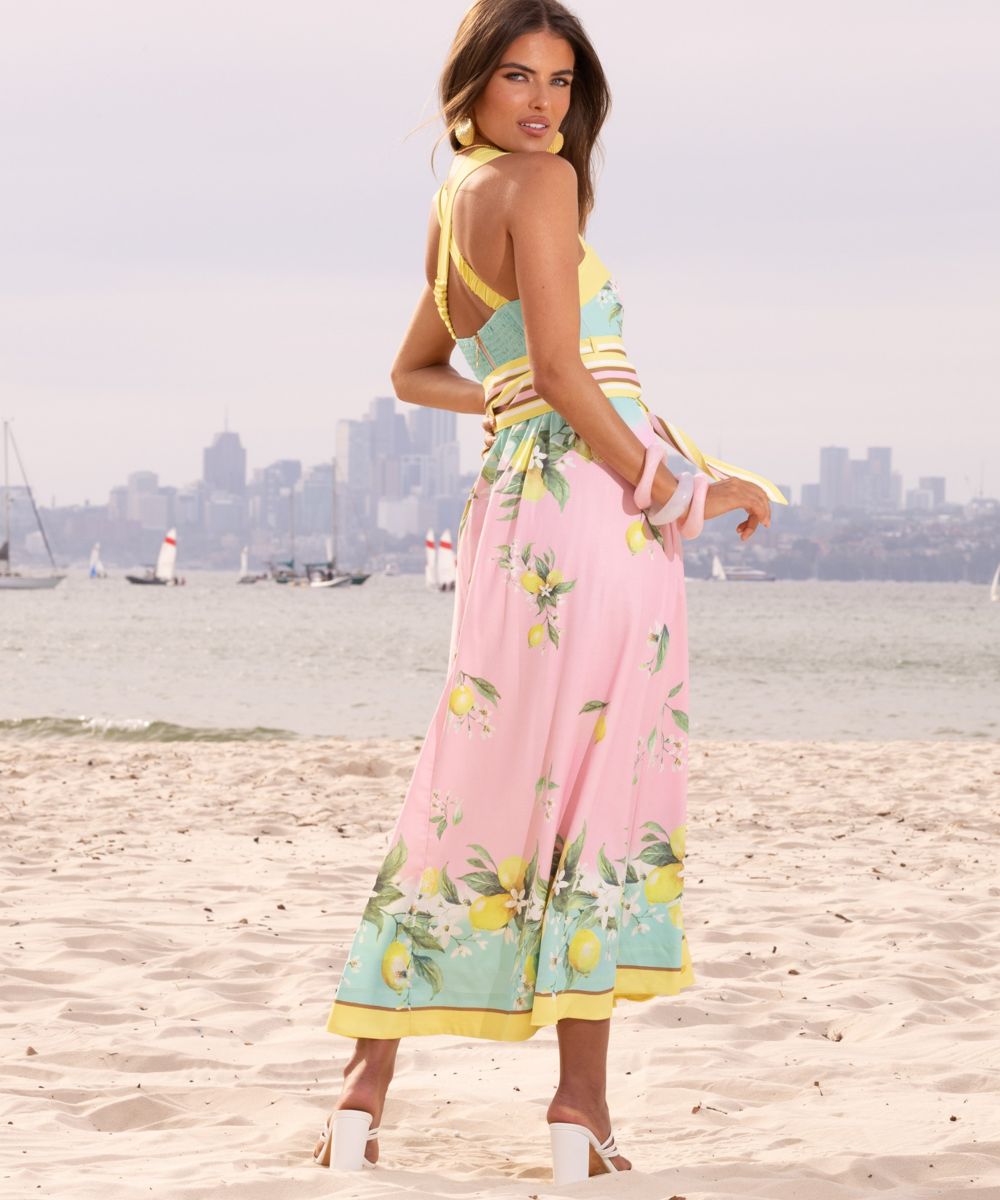 Designed with comfort in mind, the dress features elasticated back straps, shirring through the back panel and a gold exposed zipper so it’s easy to slip on and off. Lemon contrast straps frame the neckline, while the removable belt lets you change up your shape from softly draped to cinched and defined. Cotton lining keeps it breathable for warm days, long lunches and summer celebrations.