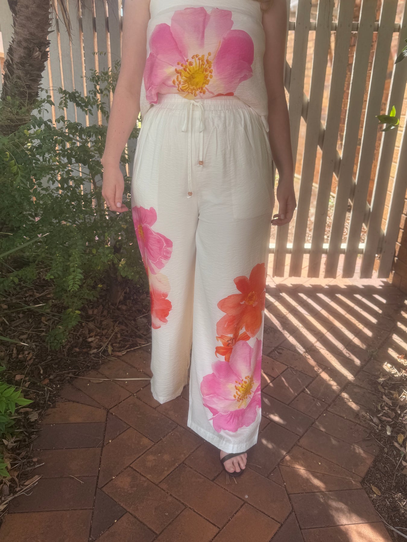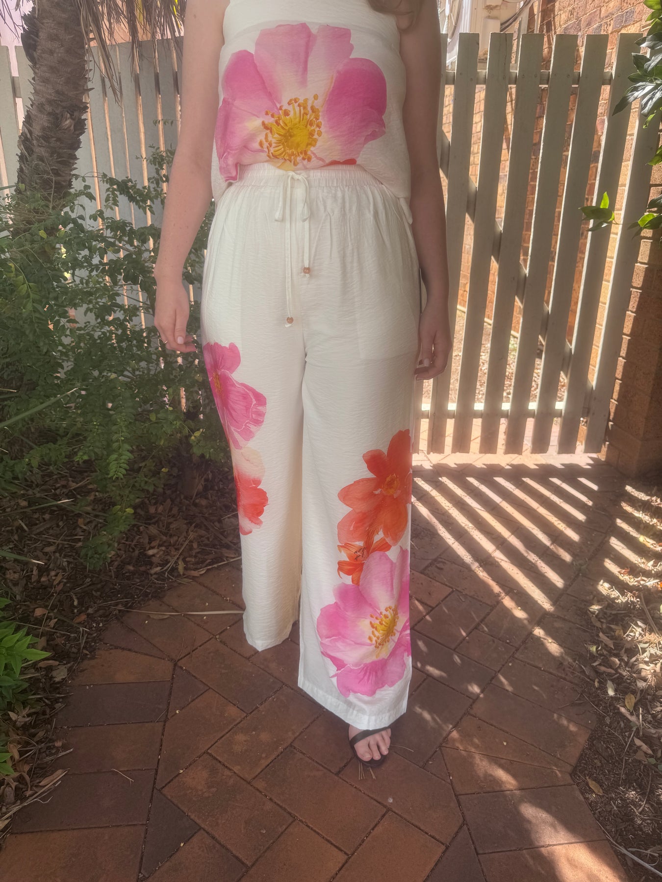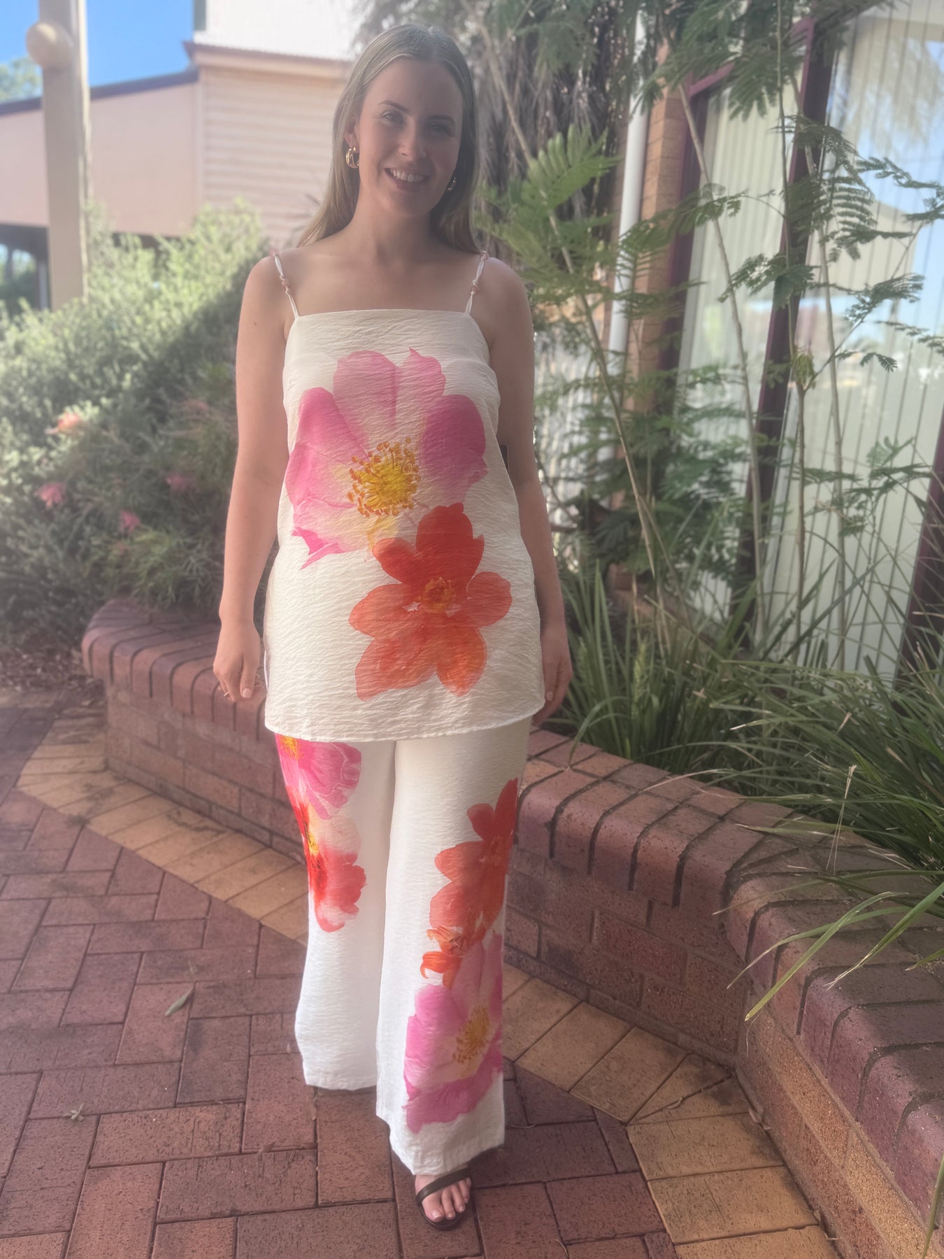 Regular price $69.95 Save $-69.95The Lorraine floral pants are a comfortable yet statement style designed for easy everyday wear. Featuring a high-waisted fit with an elasticated waistband and adjustable drawstring, they sit comfortably through the waist while falling into a relaxed wide leg. Fully lined for coverage and comfort, the lightweight fabric moves beautifully with the body. Finished with a bold floral print on a crisp white base, these pants pair perfectly with the matching Lorraine spaghetti strap top for a coordinated set or can be styled with a simple tee or tank.