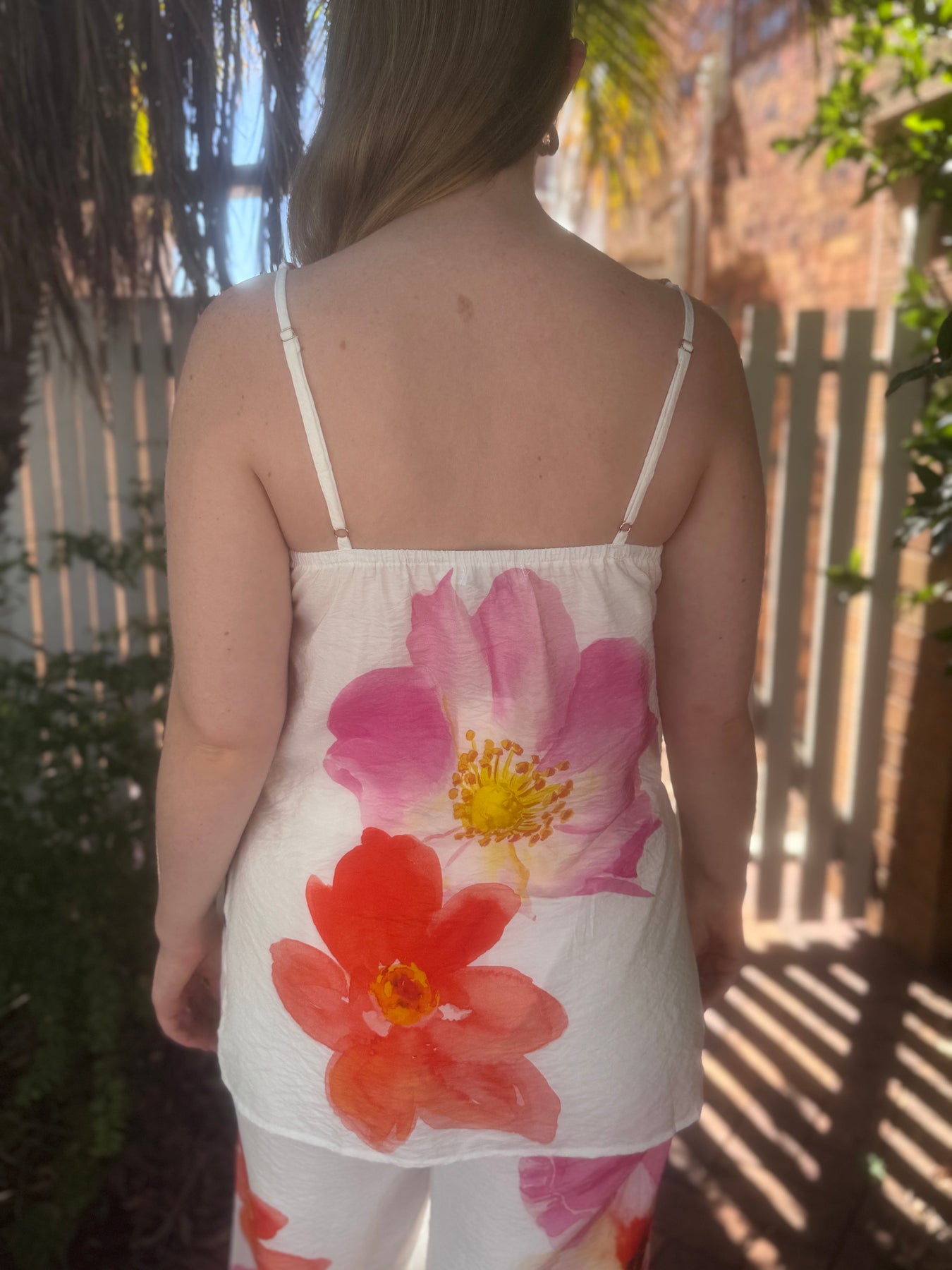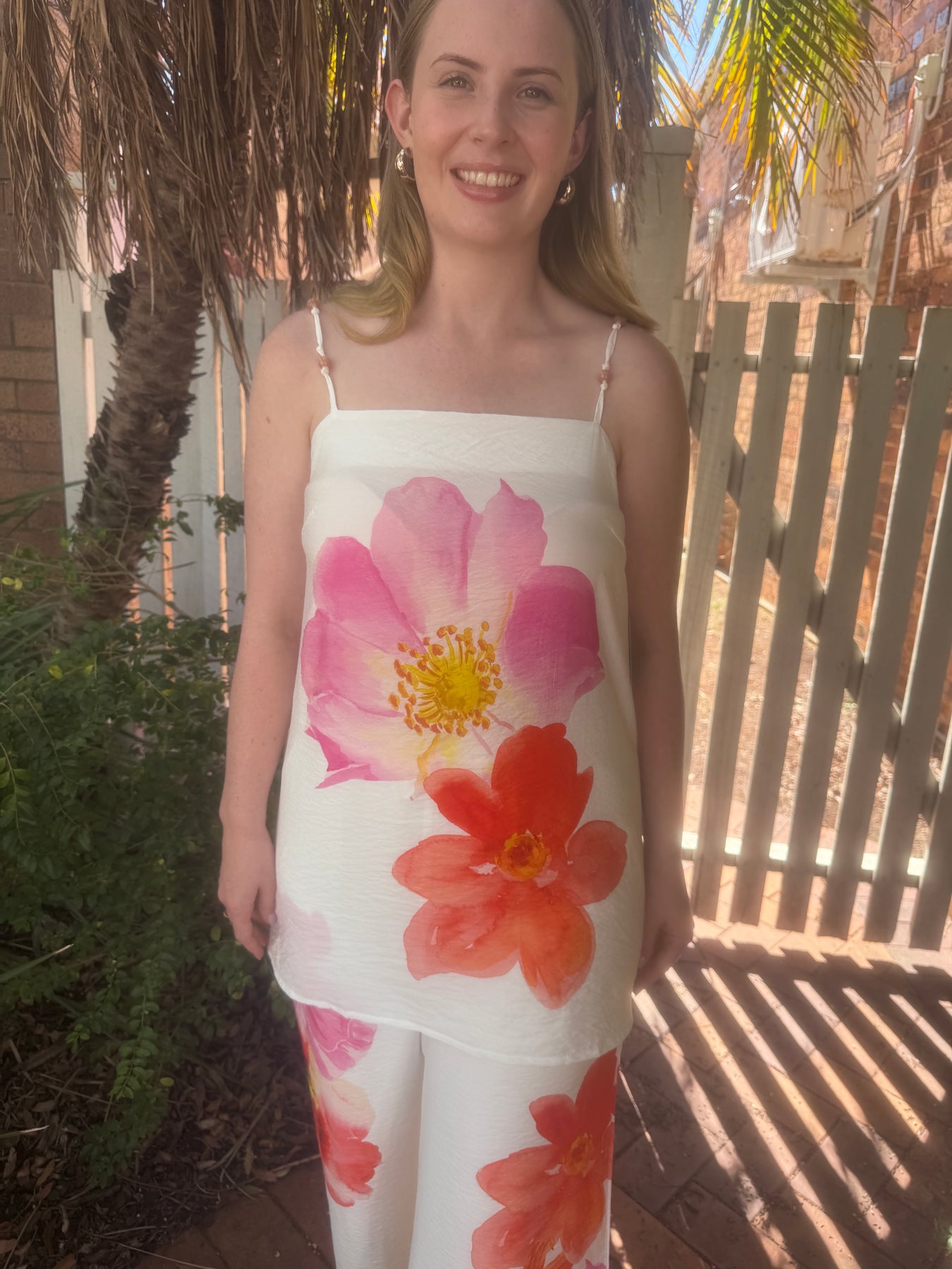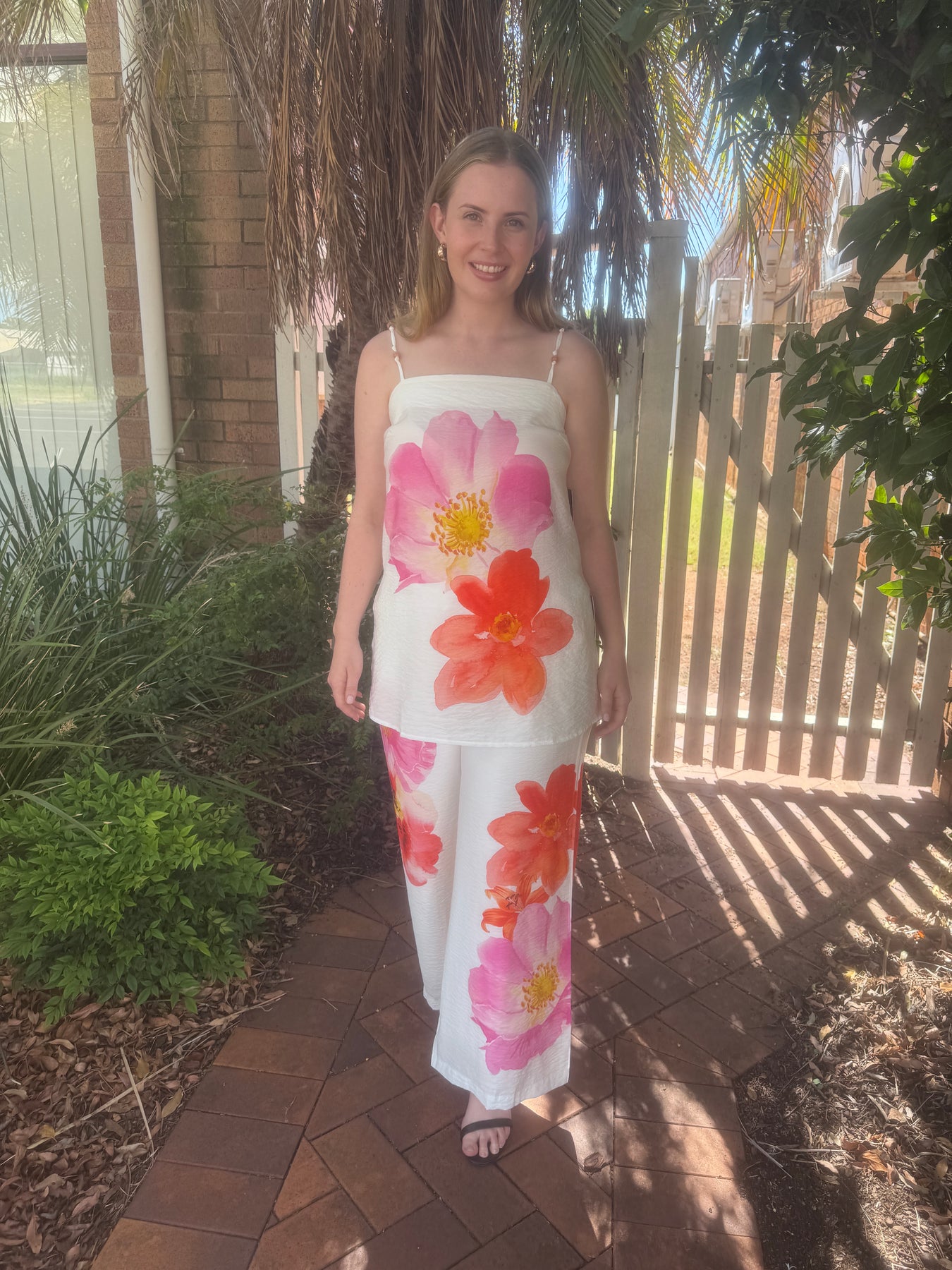 Regular price $69.95 Save $-69.95The Lorraine floral pants are a comfortable yet statement style designed for easy everyday wear. Featuring a high-waisted fit with an elasticated waistband and adjustable drawstring, they sit comfortably through the waist while falling into a relaxed wide leg. Fully lined for coverage and comfort, the lightweight fabric moves beautifully with the body. Finished with a bold floral print on a crisp white base, these pants pair perfectly with the matching Lorraine spaghetti strap top for a coordinated set or can be styled with a simple tee or tank.