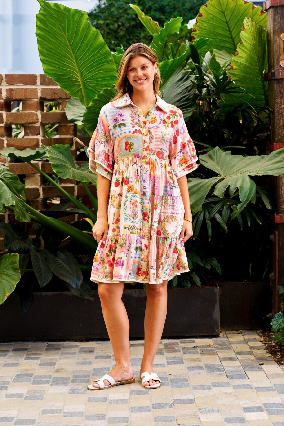 Boho Ana Dress multi print tiered shirt dress front view with model sitting on bench seat