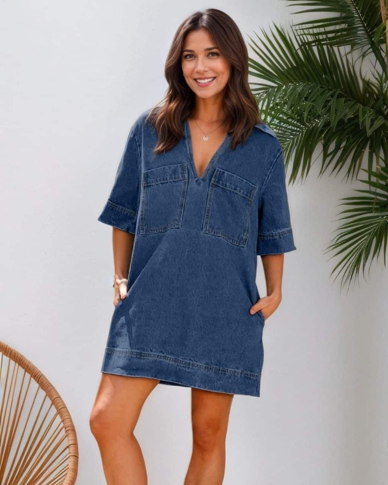 Front view of Mutig cotton mini denim dress featuring deep V neckline and patch pockets