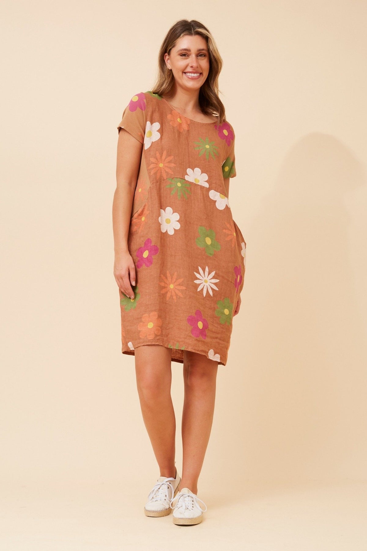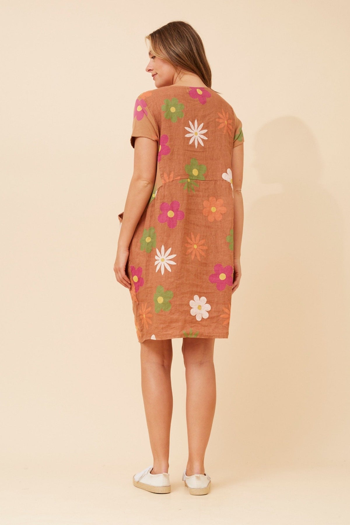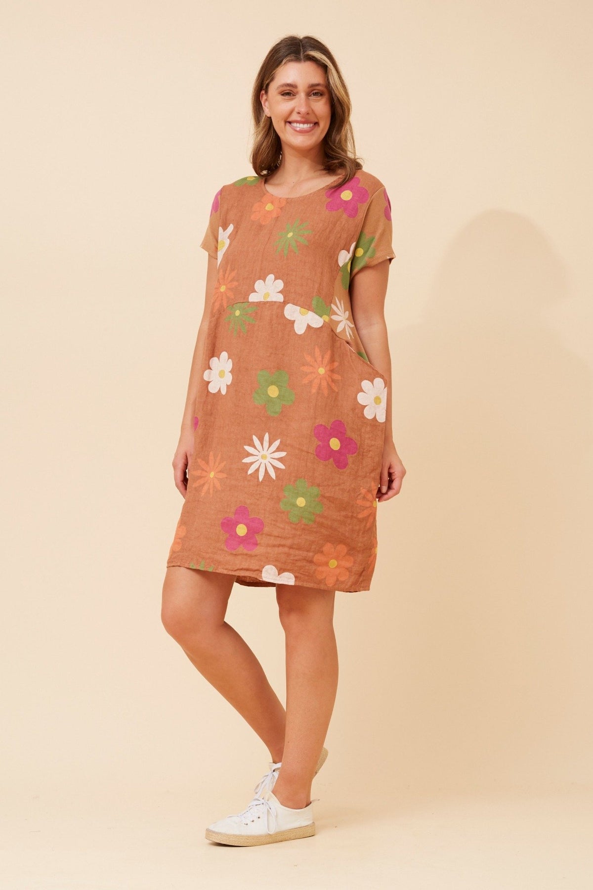 Regular price $89.95 Save $-89.95The Floral Print Linen Dress from Bottega Moda by Caroline Morgan is an easy everyday style with a relaxed silhouette and playful floral print, designed in a breathable linen fabric with a soft round neckline, short sleeves and a gently shaped bodice that falls into a comfortable knee-length hem, finished with practical side pockets making it a versatile piece for casual days, weekends and festive occasions