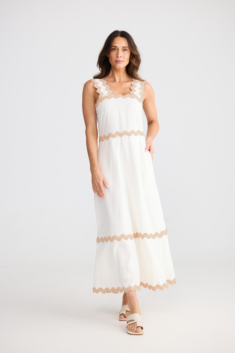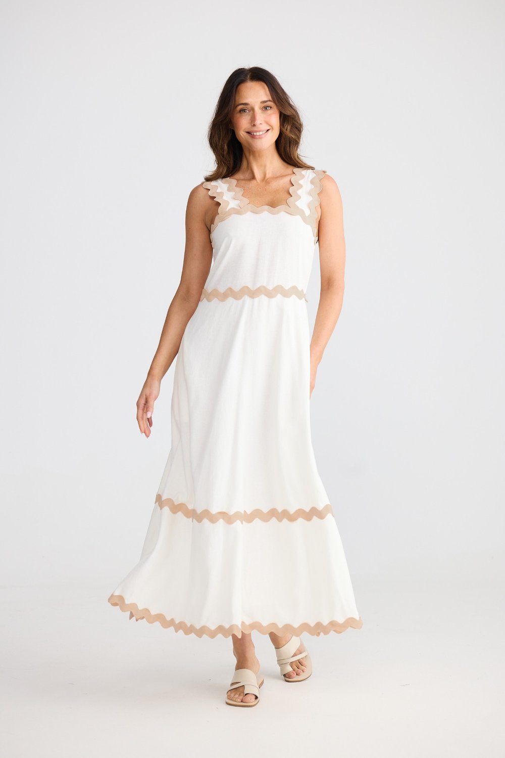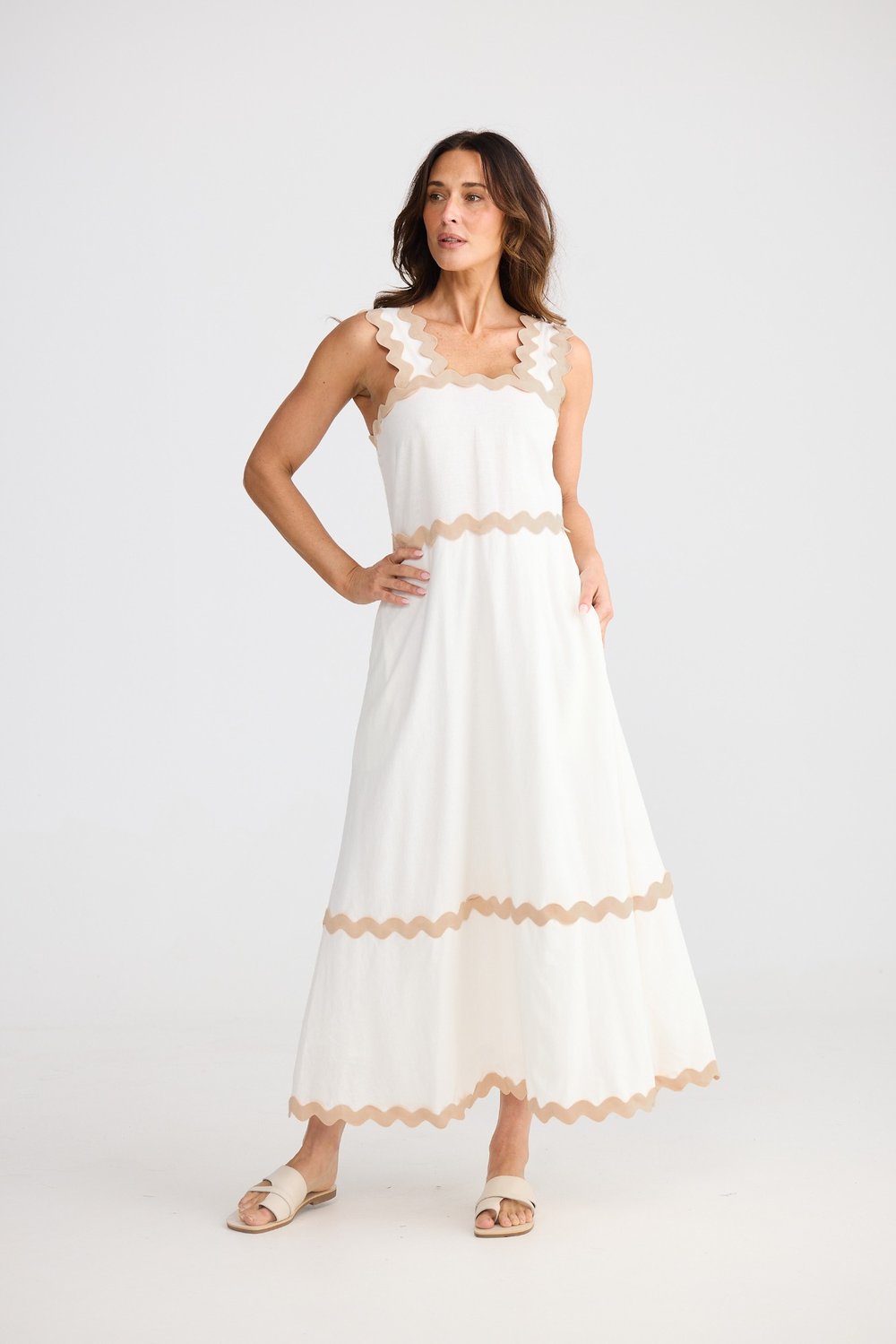 Regular price $189.95 Save $-189.95The Marlo Midi Dress by Brave + True brings modern femininity and fresh summer charm in a natural off-white hue. Crafted from a breathable linen-viscose blend, this stunning midi features a flattering square neckline, wide straps, and signature ric rac trim for a playful yet elegant edge. The flowing A-line silhouette creates beautiful movement, while the invisible back zip ensures a seamless fit. Perfect for summer events, long lunches or relaxed weekends, this is a timeless piece that pairs effortlessly with sandals, wedges, or a wide-brim hat for an easy, polished look.