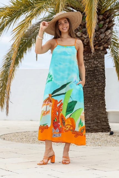 Regular price $95.00 Save $-95.00Inspired by tropical escapes and endless summer days, the Rio Maxi Dress by Joop & Gypsy brings vibrant vacation energy to your wardrobe. Crafted from soft 100% viscose, it drapes beautifully with a relaxed silhouette that moves effortlessly with you. The bright turquoise and orange tropical print adds a playful, exotic touch — perfect for sunny holidays or beachside gatherings.
